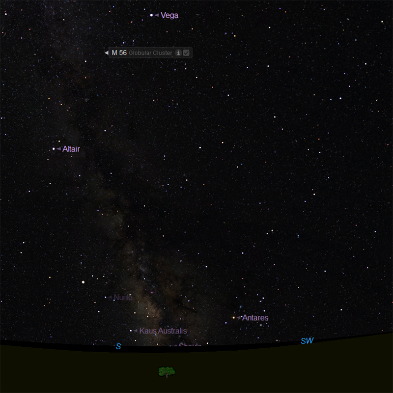 4-inch telescopes show a round ball of light, but do not reveal much detail. Visually, observers can only see the cluster’s central region, about 3 arc minutes in diameter. The best time of year to observe M56 is during the summer months.