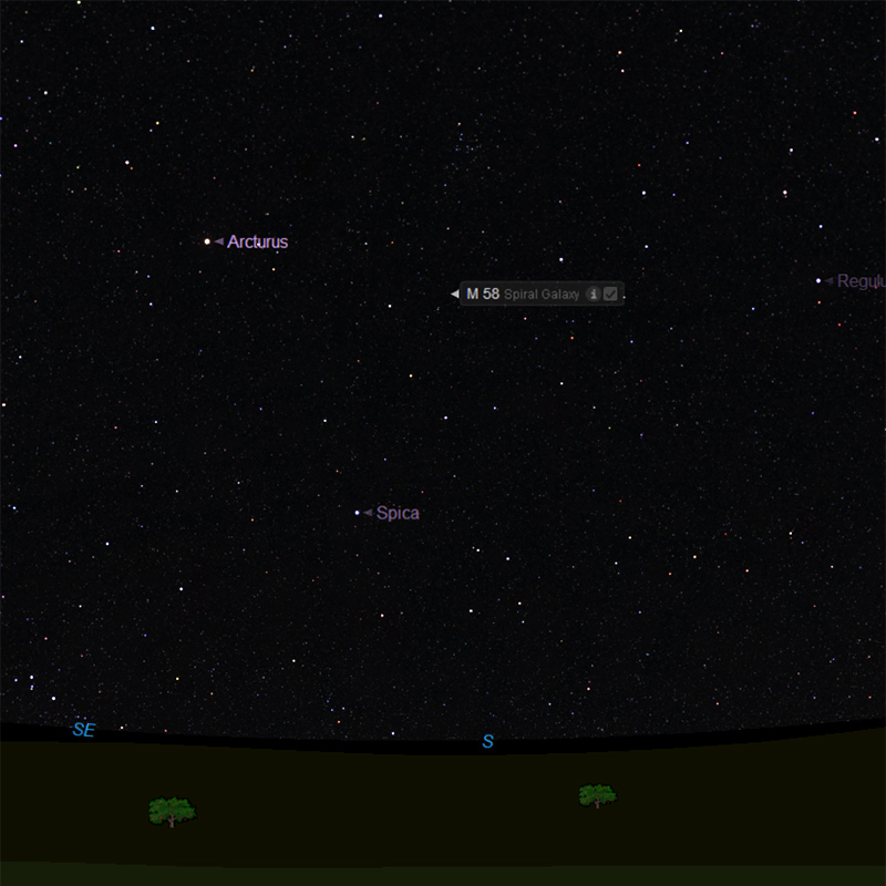 4-inch and larger telescopes show the galaxy’s halo, while 8-inch telescopes reveal a hint of the galaxy’s bar. The best time of year to observe M58 is during the spring.