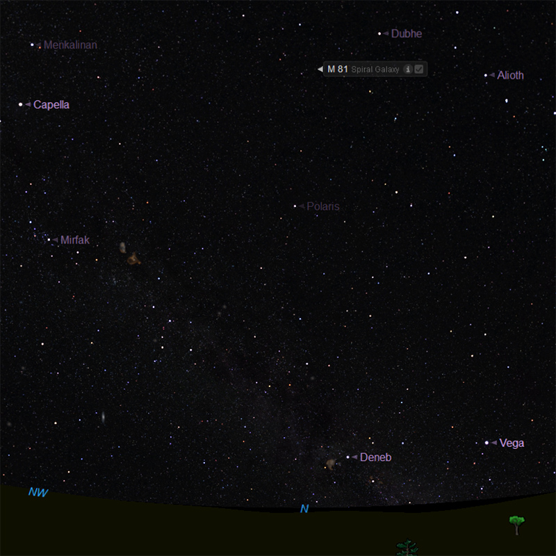 3-inch telescopes show M81 as a hazy, bright oval-shaped patch of light, while 6-inch telescopes reveal the galaxy’s bright core surrounded by a faint halo.